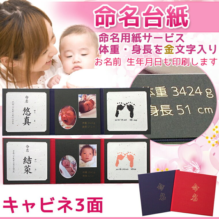 命名台紙 命名紙 付き 名入れサービス【和紙に名前を印刷・中枠に身長体重入れサービス】【キャビネ3面】手形足形用和紙2枚付き。(インク無し)