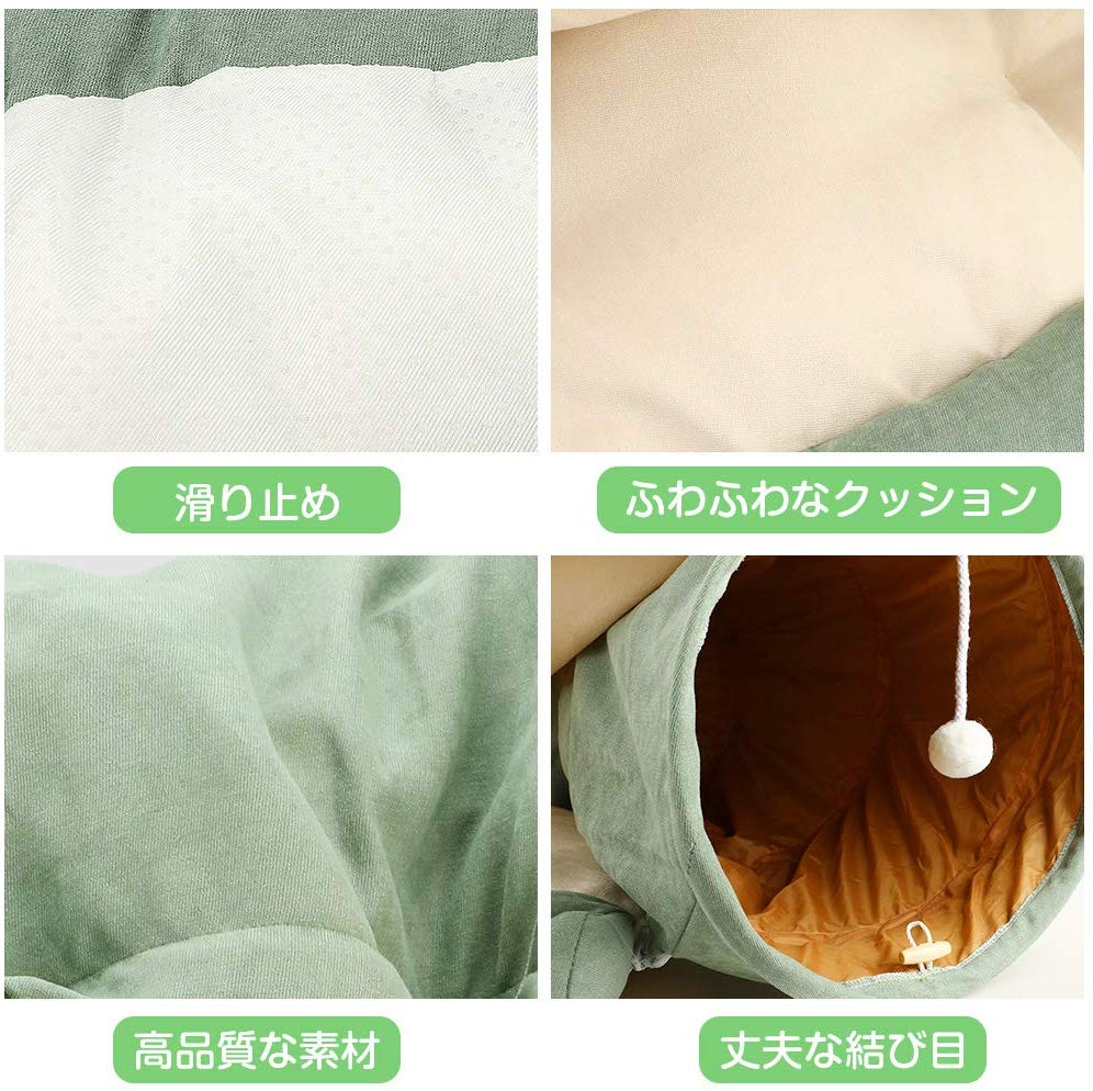 ►商品名:多機能な猫ハウス ►材質:ポリエステル綿 ►カラー:抹茶色 ►重量:約1kg ►ベッドのサイズ:52cm ►トンネルのサイズ: 126cm* 27cm ►適用:犬や猫などの小動物 ►特徴:半月型、多機能、保温性優れ、収納可能、四季適用 ペットちゃんの遊園地! 多機能な猫ハウス:猫ちゃんは好奇心がいっぱいで、トンネルと狭いところが大好きです。