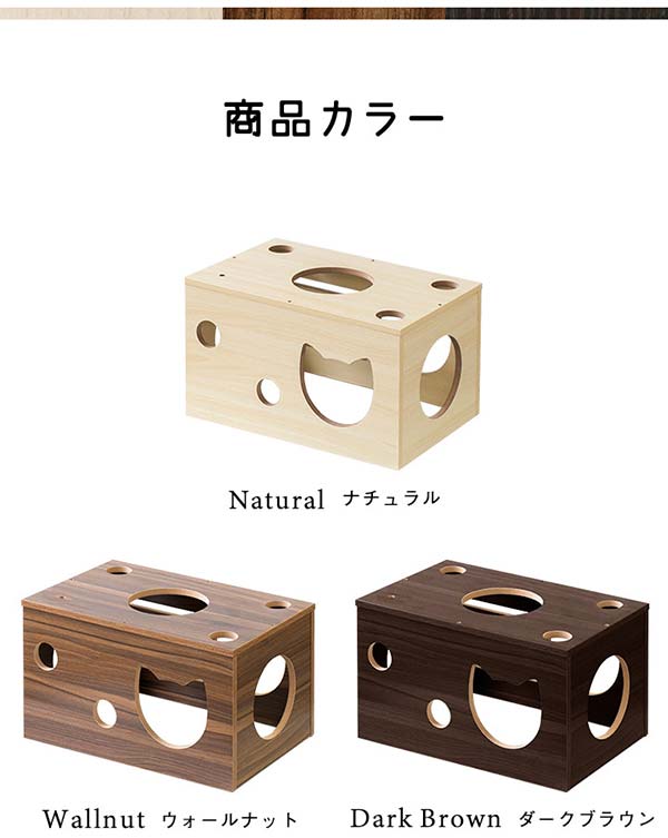 [用途・シーン] 猫 おもちゃ 猫箱 ボックス 遊び 一人遊び ねこ ネコ 玩具 オモチャ 小屋 室内 ストレス発散 運動不足 対策 多頭飼い シニア キャット 猫用 猫ベッド ペット用品 ペットグッズ キャットタワー キャットハウス キャットウォーク ケージ キャットケイブ キャットベッド キャットケージ ダンボールハウス 爪とぎ キャットトイレ ハンモック ベッド トンネル 木製 省スペース 据え置き お手入れ簡単 猫じゃらし ねこじゃらし商品詳細(猫箱) カラー: ・ナチュラル ・ウォールナット ・ダークブラウン サイズ: (約)幅55cm×奥行き35cm×高さ31cm 重量: (約)6kg 材質: PVC化粧中密度繊維板 耐荷重(目安): (約)15kg 注意事項: こちらはお客様による組み立てが必要な商品です。