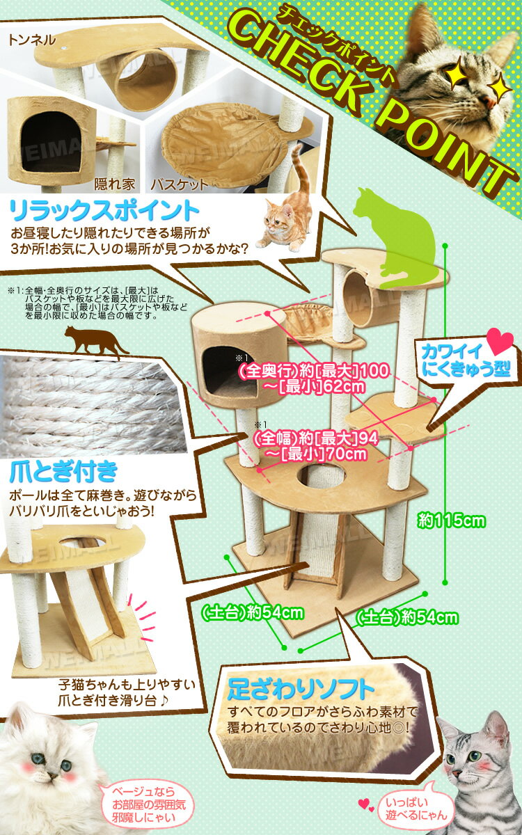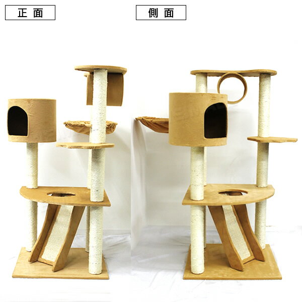 お気に入りNo.1のハンモックも付いています! 据え置きタイプで、どこでも自由に設置可能! 商 品 詳 細 内容 ・キャットタワー本体 ×1(組み立て必要) ・組み立て用工具一式(ボルト、六角レンチ) サイズ 全体:(約)幅94×奥行100×高さ115cm ※最大サイズ 台座:(約)幅54×奥行54cm 重量 (約)14kg 耐荷重 (約)15kg カラー ベージュ 材質 紙管、麻、パーティクルボード 他 保証期間 7日間 ※商品到着後7日以内の初期不良・破損のみご対応させていただきます。